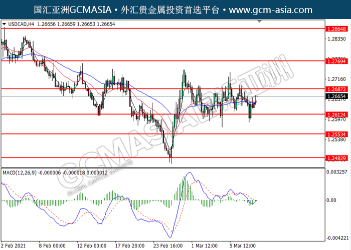 20210310 USDCAD-午间 by keyk | Mar 10, 2021 | 美元兑加元 | 0 comments GCMAsia-USDCAD USDCAD 2021-03-10 USDCAD,H4: 美加低位反弹。MACD显示空头动能略减,短期可关注多头趋势。上方关注1.2685压力和1.2770压力,下方关注1.2610支撑1.2555支撑。