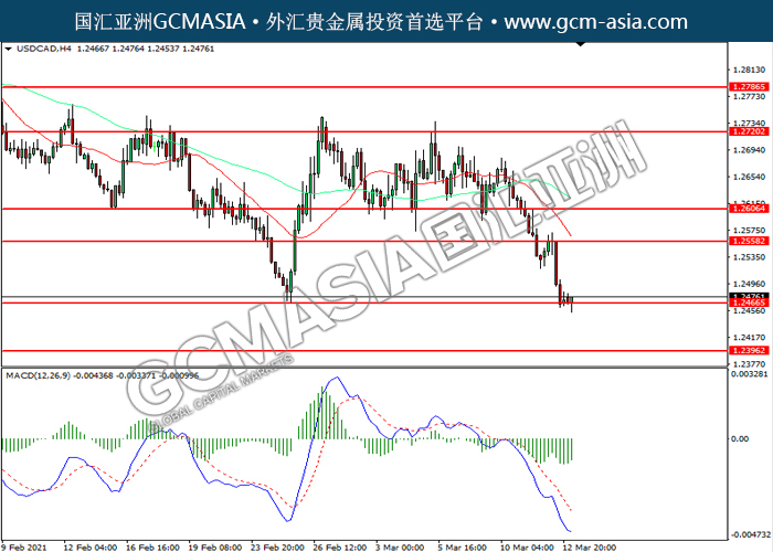 USDCAD,H4:美加震荡下行,目前测试前期支撑。然而,MACD空头动能略减,短期可关注技术性回调为主。上方关注1.2560压力和1.2605压力,下方关注1.2465支撑1.2395支撑。