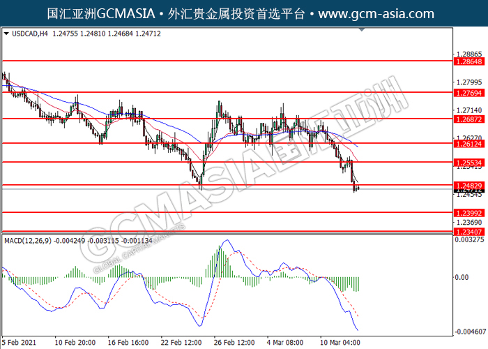 USDCAD,H4: 美加突破后持续下行。MACD显示空头信号,短期可关注空头趋势。上方关注1.2485压力和1.2555压力,下方关注1.2400支撑1.2340支撑。