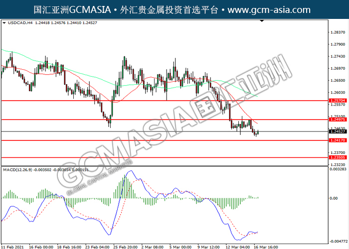 20210317 USDCAD-午间 by keyk | Mar 17, 2021 | 美元兑加元 | 0 comments GCMAsia-USDCAD USDCAD 2021-03-17 USDCAD,H4:美加震荡下行。然而,MACD多头动能略增,短期可关注技术性回调为主。上方关注1.2500压力和1.2570压力,下方关注1.2415支撑1.2350支撑。