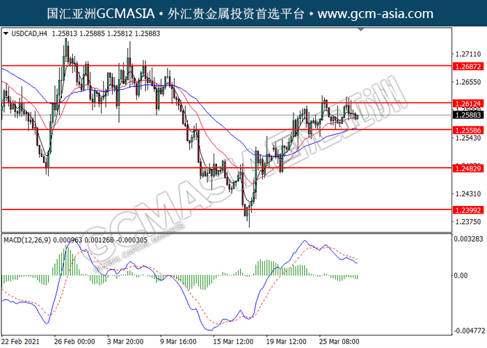 20210330 USDCAD by willy | Mar 30, 2021 | 美元兑加元 | 0 comments GCMAsia - USDCAD USDCAD 2021-03-30 USDCAD,H4: 美加高位承压后回落。MACD显示空头信号,短期可关注空头趋势。上方关注1.2610压力和1.2685压力,下方关注1.2560支撑1.2485支撑。