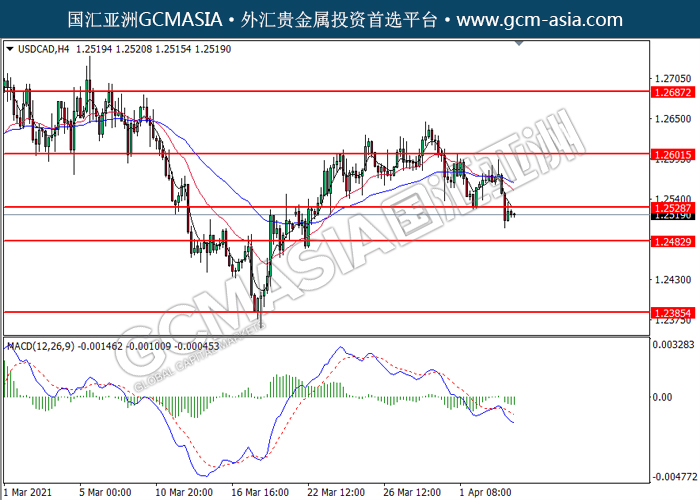USDCAD,H4: 美加突破后持续下行。MACD显示空头信号,短期可关注空头趋势。上方关注1.2530压力和1.2600压力,下方关注1.2485支撑1.2385支撑。