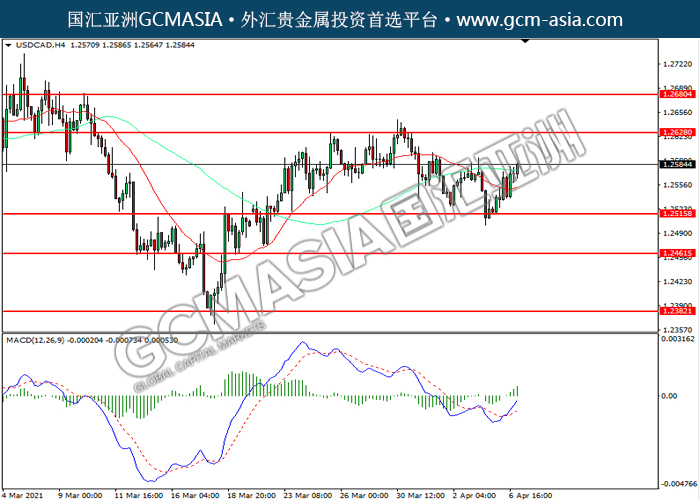 20210407 USDCAD-午间 by keyk | Apr 7, 2021 | 美元兑加元 | 0 comments GCMAsia-USDCAD USDCAD 2021-04-07 USDCAD, H4:美加震荡上行。MACD多头动能开始略增,短期可关注多头为主。上方关注1.2630压力和1.2680压力,下方关注1.2515支撑1.2460支撑。