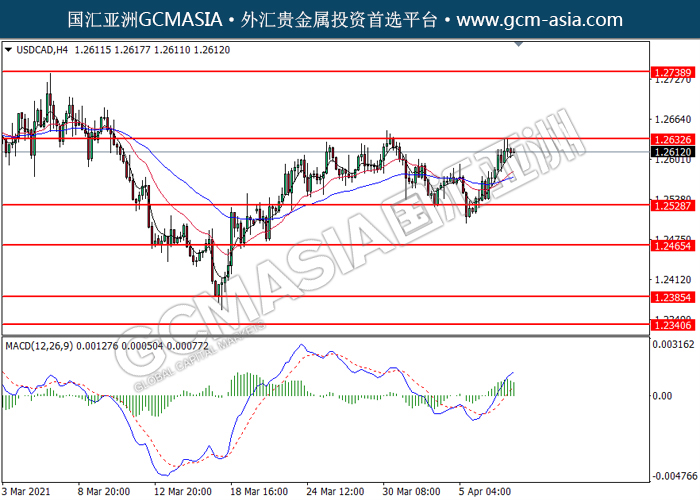 USDCAD,H4: 美加低位反弹。MACD显示多头信号,短期可关注多头趋势。上方关注1.2635压力和1.2740压力,下方关注1.2530支撑1.2465支撑。
