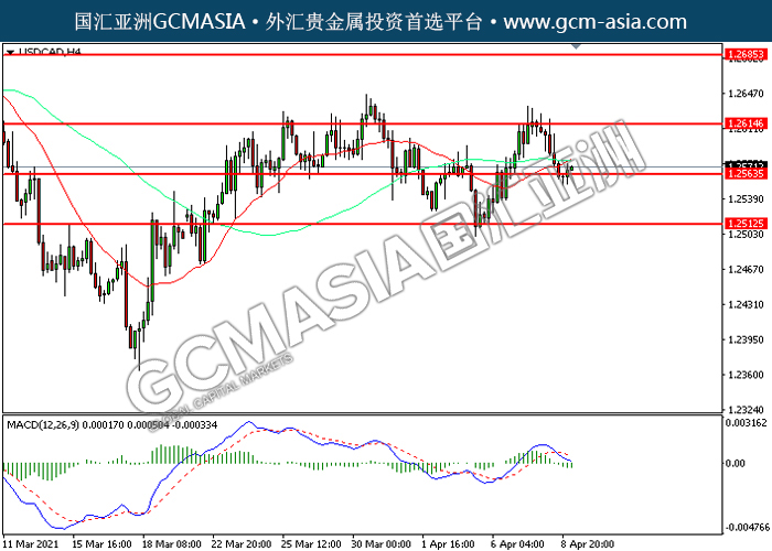 USDCAD,H4: 美加突破后持续下行,目前测试前期支撑。MACD空头动能略增,若下破可关注空头趋势。上方关注1.2615压力和1.2685压力,下方关注1.2565支撑1.2515支撑。