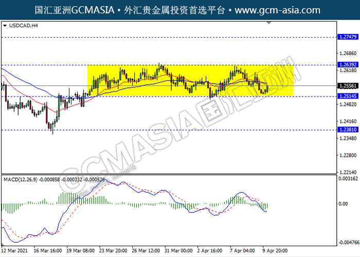 USDCAD,H4:美加仍区间震荡盘整,近期低位反弹。然而,MACD空头动能略减,短期可关注多头方向为主。上方关注1.2640压力和1.2745压力,下方关注1.2515支撑1.2380支撑。