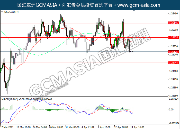 USDCAD,H4: 美加震荡下行,目前测试前期支撑。MACD空头动能略增,若下破可关注空头趋势为主。上方关注1.2565压力和1.2615压力,下方关注1.2515支撑1.2475支撑。