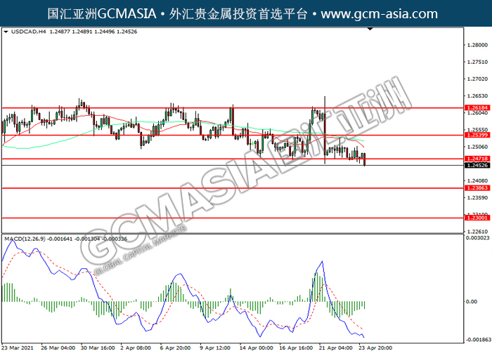 USDCAD,H4: 美加下破前期支撑,震荡下行。MACD空头动能略增,短期可关注空头为主。上方关注1.2470压力和1.2540压力,下方关注1.2385支撑1.2300支撑。