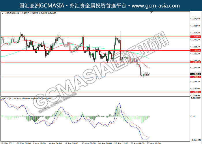 USDCAD,H4: 美加震荡下行,目前测试前期支撑。然而,MACD空头动能略减,短期可关注技术性回调为主。上方关注1.2470压力和1.2540压力,下方关注1.2385支撑1.2300支撑。