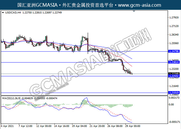 USDCAD,H4:美加空头排列,目前测试前期支撑。然而,MACD空头动能有所略减,短期关注技术性多头反弹趋势为主。上方关注1.2380压力和1.2480压力,下方关注1.2255支撑1.2100支撑。
