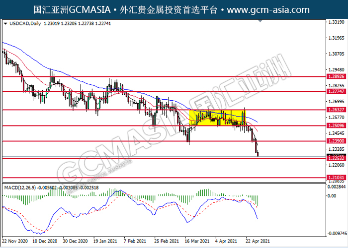 USDCAD,Daily: 美加突破后持续下行。MACD显示空头信号,动能偏弱,短期可持续关注空头为主。上方关注1.2390压力和1.2510压力,下方关注1.2255支撑1.2105支撑。