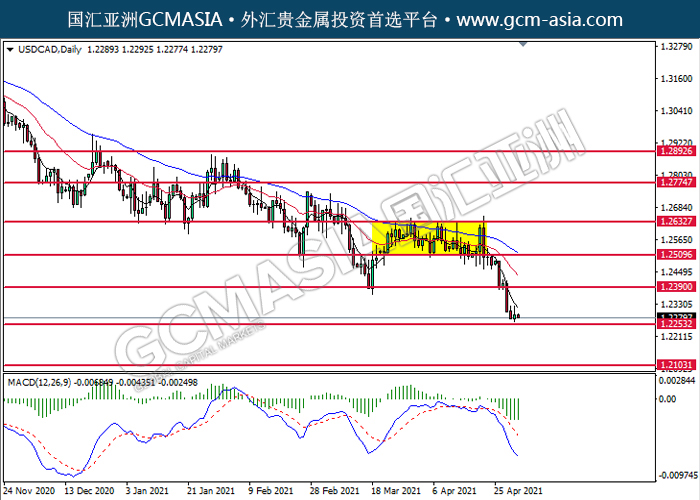 USDCAD,Daily: 美加突破后持续下行。MACD显示空头信号,动能偏弱,短期可持续关注空头为主。上方关注1.2390压力和1.2510压力,下方关注1.2255支撑1.2105支撑。