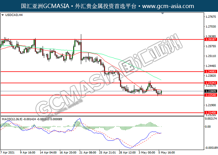 USDCAD,H4: 美加震荡下行,目前测试前期支撑。MACD多头动能略减,若下破可关注空头为主。上方关注1.2335压力和1.2410压力,下方关注1.2255支撑1.2140支撑。