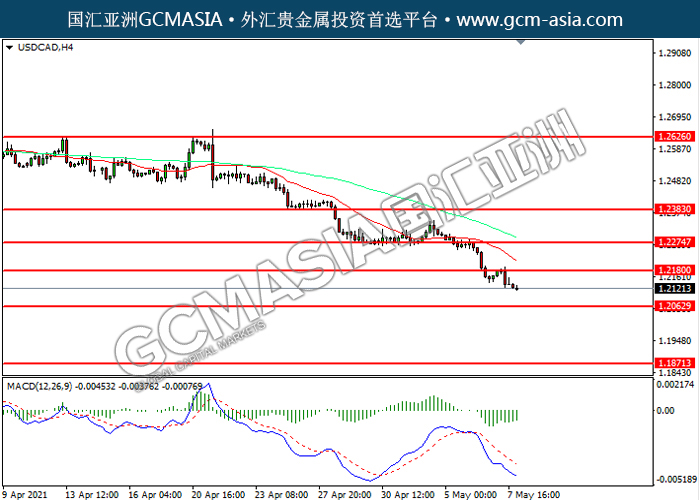 20210510 USDCAD by willy | May 10, 2021 | 美元兑加元 | 0 comments GCMAsia-USDCAD USDCAD 2021-05-10 USDCAD,H4: 美加震荡下行。然而,MACD空头动能略减,短期可关注技术性回调为主。上方关注1.2180压力和1.2275压力,下方关注1.2065支撑1.1870支撑。