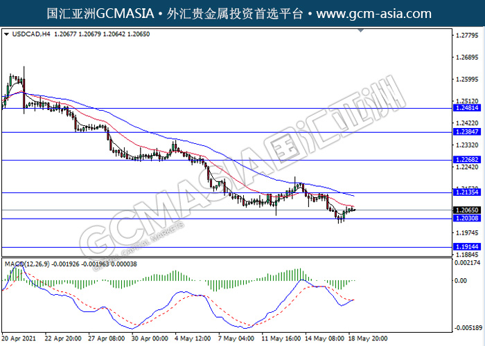 20210519 USDCAD-午间 by keyk | May 19, 2021 | 美元兑加元 | 0 comments GCMAsia-USDCAD USDCAD 2021-05-19 USDCAD,H4:美加触底反弹上行。MACD形成金叉,空头动能略减,短期继续看多反弹为主。上方关注1.2135压力和1.2270压力,下方关注1.2030支撑1.1915支撑。