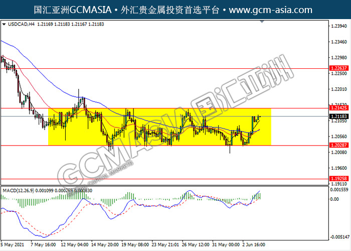 USDCAD,H4: 仍区间震荡交易,目前测试靠近前期压力。然而,MACD动能略增,若突破可关注多头方向为主。上方关注1.2140压力和1.2265压力,下方关注1.2030支撑1.1925支撑。