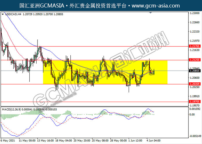 20210607 USDCAD-午间 by keyk | Jun 7, 2021 | 美元兑加元 | 0 comments USDCAD,H4: 仍区间震荡交易,近期高位承压回落。然而,MACD形成死叉,动能略减,短期关注空头方向为主。上方关注1.2125压力和1.2175压力,下方关注1.2035支撑1.1970支撑。