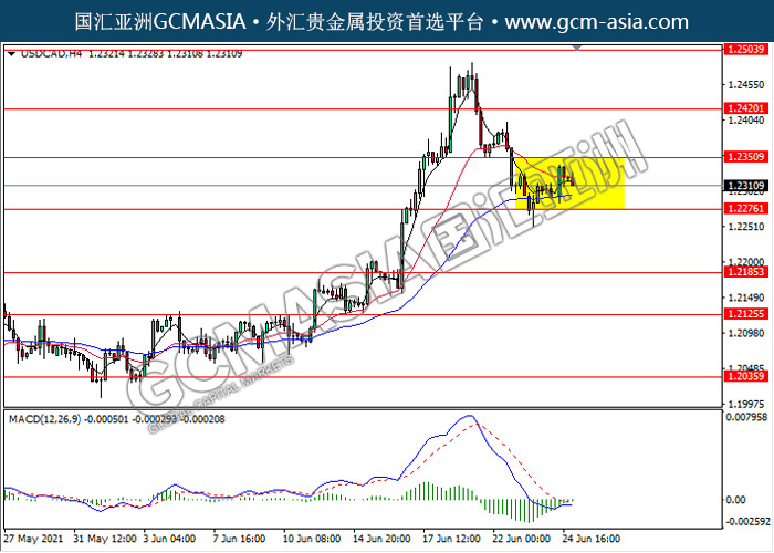 USDCAD,H4: 美加仍区间震荡盘整。然而,MACD空头动能略减,短期关注多头方向为主。上方关注1.2350压力和1.2420压力,下方关注1.2275支撑1.2185支撑。