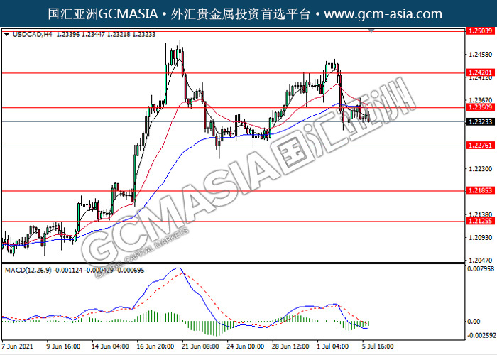 20210706 USDCAD-午间 by skylow | Jul 6, 2021 | 美元兑加元 | 0 comments USDCAD,H4: 美加高位承压回落。MACD动能略减,短期继续看空回调为主。上方关注1.2350压力和1.2420压力,下方关注1.2275支撑1.2185支撑。