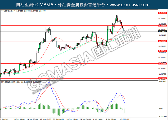 20210712 USDCAD by willy | Jul 12, 2021 | 美元兑加元 | 0 comments USDCAD,H4: 美加震荡下行。MACD空头动能略增,短期可关注空头为主。上方关注1.2495压力和1.2605压力,下方关注1.2360支撑1.2275支撑。
