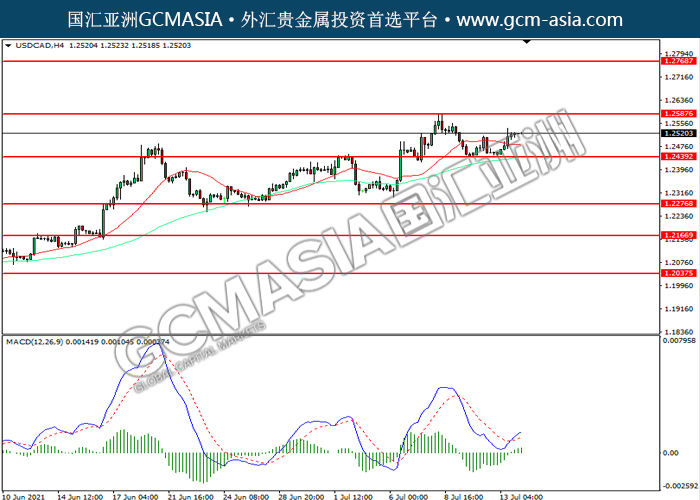 20210714 USDCAD by willy | Jul 14, 2021 | 美元兑加元 | 0 comments USDCAD,H4: 美加震荡上行。MACD多头动能略增,短期可关注多头为主。上方关注1.2585压力和1.2770压力,下方关注1.2440支撑1.2275支撑。