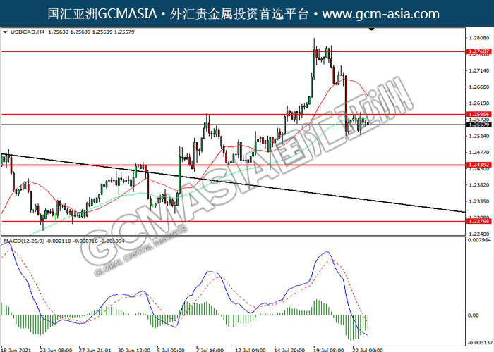 20210723 USDCAD by willy | Jul 23, 2021 | 美元兑加元 | 0 comments USDCAD,H4: 美加震荡下行。然而,MACD空头动能略减,短期可关注技术性回调为主。上方关注1.2585压力和1.2770压力,下方关注1.2440支撑1.2275支撑。