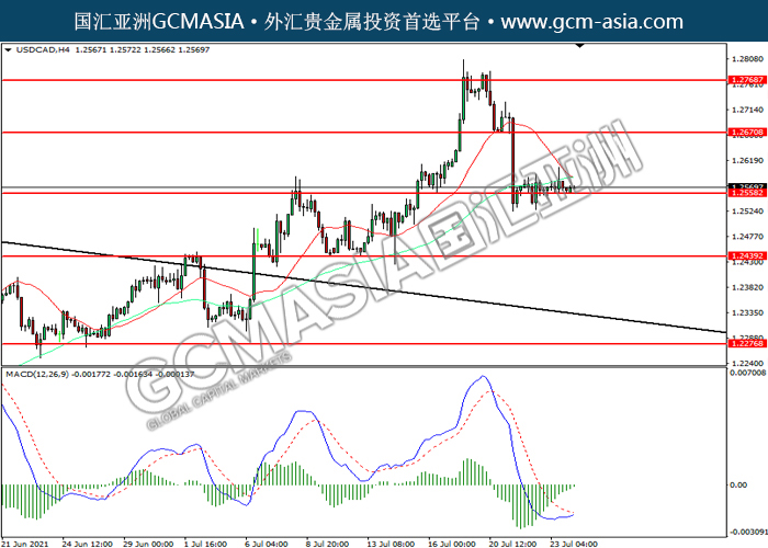 20210726 USDCAD by willy | Jul 26, 2021 | 美元兑加元 | 0 comments USDCAD,H4: 美加震荡下行,目前测试前期支撑。然而,MACD空头动能略减,短期可关注技术性回调为主。上方关注1.2670压力和1.2770压力,下方关注1.2560支撑1.2440支撑。
