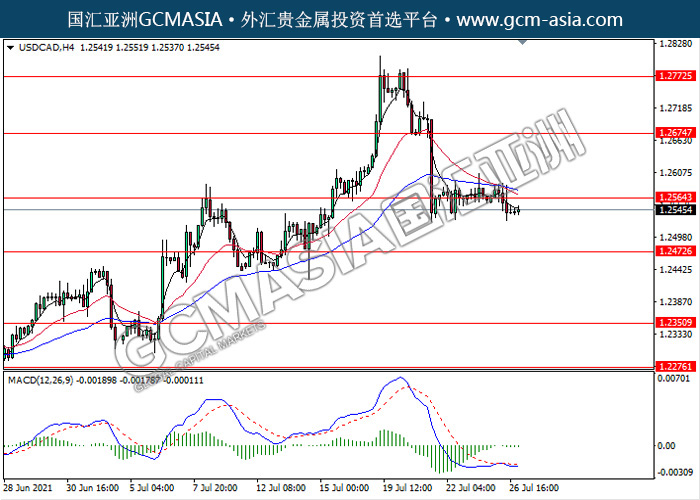 USDCAD,H4: 美加突破前期支撑,震荡下行。MACD显示空头信号,动能略减,短期继续看空方向为主。上方关注1.2565和1.2675压力,下方关注1.2470支撑1.2350支撑。