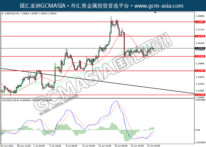 20210728 USDCAD-午间 by willy | Jul 28, 2021 | 美元兑加元 | 0 comments USDCAD,H4: 美加震荡上行。MACD多头动能增,短期可关注多头为主。上方关注1.2670压力和1.2770压力,下方关注1.2535支撑1.2440支撑。