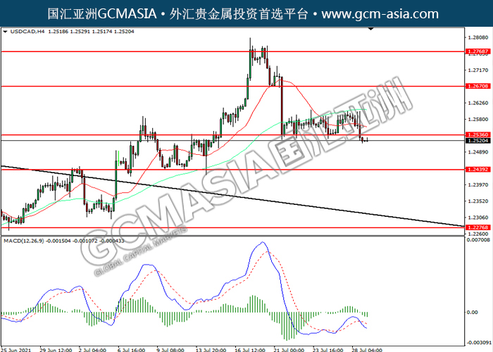 20210729 USDCAD by willy | Jul 29, 2021 | 美元兑加元 | 0 comments USDCAD,H4: 美加下破前期支撑,震荡下行。MACD空头动能增,短期可关注空头为主。上方关注1.2535压力和1.2670压力,下方关注1.2440支撑1.2275支撑。