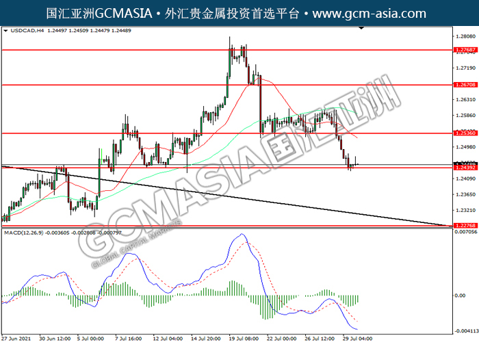 20210730 USDCAD-午间 by willy | Jul 30, 2021 | 美元兑加元 | 0 comments USDCAD,H4: 美加震荡下行,目前测试前期支撑。然而,MACD空头动能减,短期可关注技术性回调为主。上方关注1.2535压力和1.2670压力,下方关注1.2440支撑1.2275支撑。
