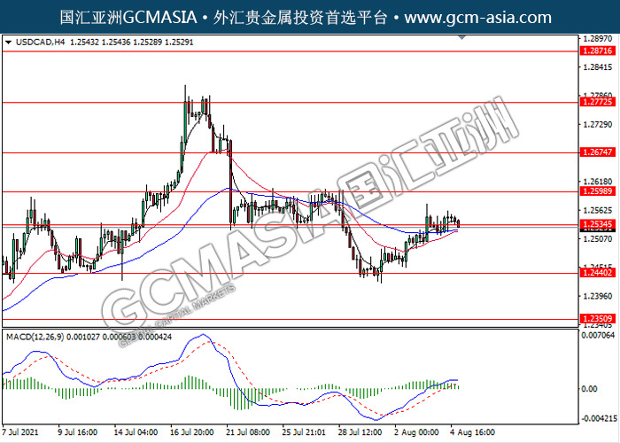 20210805 USDCAD-午间 by keyk | Aug 5, 2021 | 美元兑加元 | 0 comments USDCAD,H4: 美加震荡盘整,目前测试前期支撑。然而,MACD多头动能略减,若突破可关注空头方向为主。上方关注1.2600压力和1.2675压力,下方关注1.2535支撑1.2440支撑。