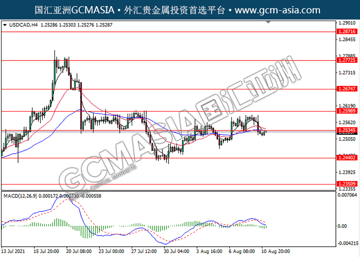 20210811 USDCAD-午间 by keyk | Aug 11, 2021 | 美元兑加元 | 0 comments USDCAD,H4: 美加突破前期支撑,震荡下行。MACD动能略减,短期可继续看空为主。上方关注2535压力和1.2600压力,下方关注1.2440支撑和1.2350支撑。