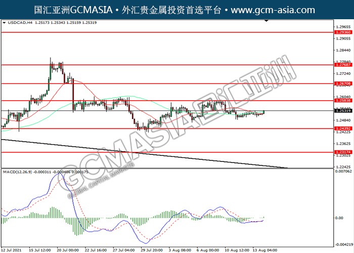 20210816 USDCAD by willy | Aug 16, 2021 | 美元兑加元 | 0 comments USDCAD,H4: 美加震荡下行。然而,MACD多头动能增,短期可关注技术性回调为主。上方关注1.2585压力和1.2670压力,下方关注1.2440支撑1.2315支撑。