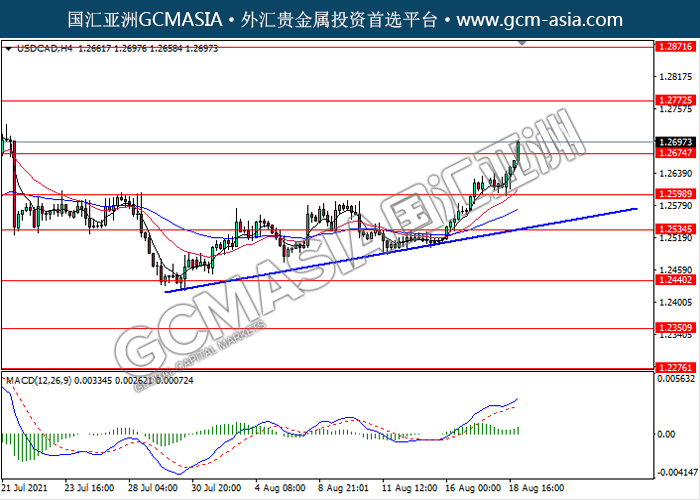 20210819 USDCAD-午间 by keyk | Aug 19, 2021 | 美元兑加元 | 0 comments USDCAD,H4: 美加突破前期压力,多头排列。MACD动能持续略增,中期继续看多为主。上方关注1.2770压力和1.2870压力,下方关注1.2675支撑和1.2600支撑。