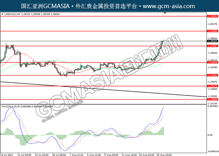 USDCAD,H4: 美加突破前期压力,震荡上行。MACD多头动能增,短期可关注多头为主。上方关注1.2935压力和1.3105压力,下方关注1.2770支撑1.2585支撑。