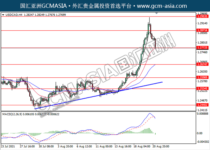USDCAD,H4: 美加空头排列,目前测试前期支撑。MACD形成死叉,动能略减,若突破可继续看空为主。上方关注1.2870压力和1.2955压力,下方关注1.2770支撑和1.2675。