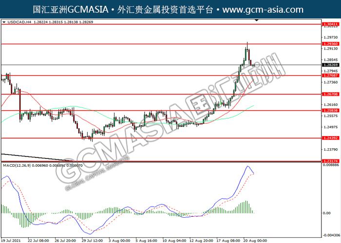 USDCAD,H4: 美加高位回落。MACD多头动能减,短期可关注空头为主。上方关注1.2935压力和1.3040压力,下方关注1.2770支撑1.2670支撑。