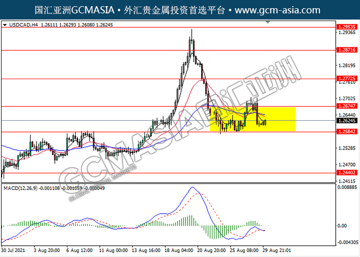 USDCAD,H4: 美加仍区间震荡交易,目前测试靠近前期支撑。然而,MACD形成死叉,多头动能略减,若突破可关注空头方向为主。上方关注1.2675压力和1.2770压力,下方关注1.2585支撑和1.2440支撑。