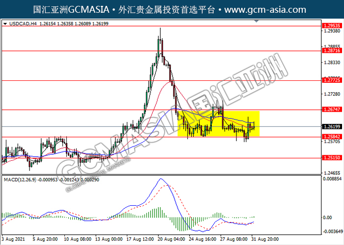 20210901 USDCAD-午间 by keyk | Sep 1, 2021 | 美元兑加元 | 0 comments USDCAD,H4: 美加仍区间震荡交易,近期低位反弹上行。MACD形成金叉,动能略增,短期可继续看多为主。上方关注1.2675压力和1.2770压力,下方关注1.2585支撑和1.2515支撑。