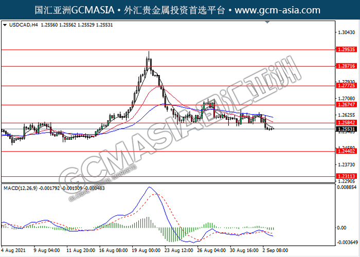 20210903 USDCAD-午间 by keyk | Sep 3, 2021 | 美元兑加元 | 0 comments USDCAD,H4: 美加突破前期支撑,震荡下行。MACD动能持续略减,短期可继续看空为主。上方关注1.2585压力和1.2675压力,下方关注1.2440支撑和1.2310支撑。