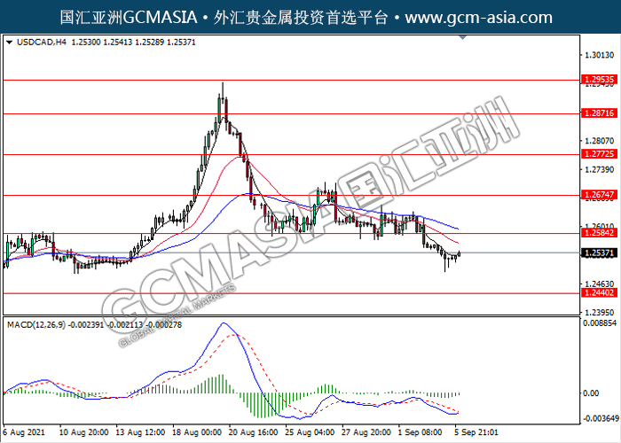 USDCAD,H4: 美加低位反弹上行。MACD空头动能略减,短期可继续看多反弹为主。上方关注1.2585压力和1.2675压力,下方关注1.2440支撑和1.2310支撑。