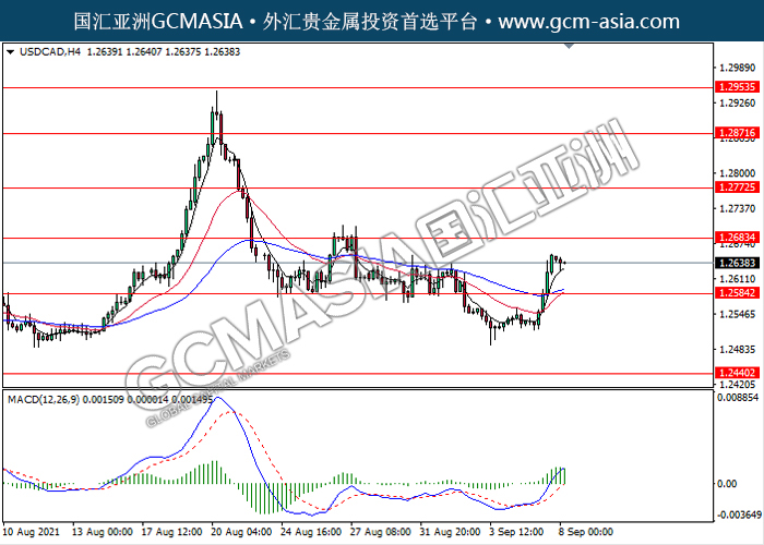20210908 USDCAD-午间 by keyk | Sep 8, 2021 | 美元兑加元 | 0 comments USDCAD,H4: 美加多头排列,目前测试靠近前期压力。MACD动能略增,若突破可继续看多为主。上方关注1.2685压力和1.2770压力,下方关注1.2585支撑和1.2440支撑。