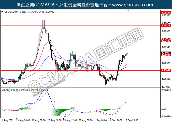 20210909 USDCAD-午间 by keyk | Sep 9, 2021 | 美元兑加元 | 0 comments USDCAD,H4: 美加突破前期压力,多头排列。MACD动能持续略增,短期可继续看多为主。上方关注1.2770压力和1.2870压力,下方关注1.2685支撑和1.2585支撑。