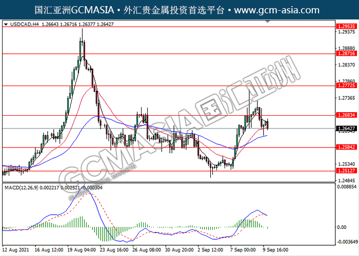 20210910 USDCAD-午间 by keyk | Sep 10, 2021 | 美元兑加元 | 0 comments USDCAD,H4: 美加高位承压回落下跌。MACD形成死叉,动能略减,短期可继续看空为主。上方关注1.2685压力和1.2770压力,下方关注1.2585支撑和1.2510支撑。