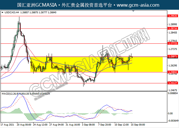 20210915 USDCAD-午间 by keyk | Sep 15, 2021 | 美元兑加元 | 0 comments USDCAD,H4: 美加仍区间震荡交易,目前测试前期压力。然而,MACD形成金叉,动能略增,若突破可继续看多为主。上方关注1.2685压力和1.2770压力,下方关注1.2585支撑和1.2510支撑。