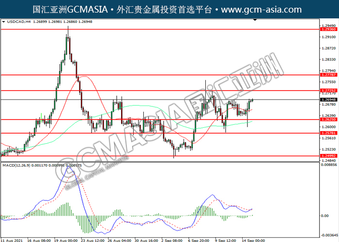 20210915 USDCAD by willy | Sep 15, 2021 | 美元兑加元 | 0 comments USDCAD,H4: 美加低位反弹。MACD多头动能略增,短期可关注多头为主。上方关注1.2725压力和1.2780压力,下方关注1.2625支撑1.2580支撑。