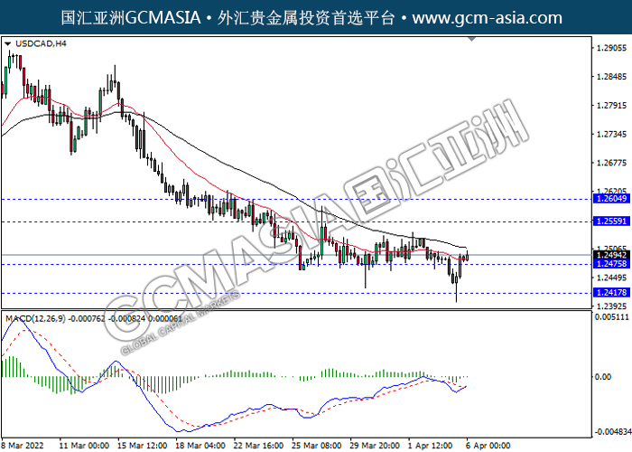 20220406 USDCAD-午间 by willy | Apr 6, 2022 | 美元兑加元 | 0 comments USDCAD,H4:美加突破前期压力,震荡上行。MACD多头动能略增,短期可关注多头为主。上方关注1.2560压力和1.2605压力,下方关注1.2475支撑和1.2415支撑。