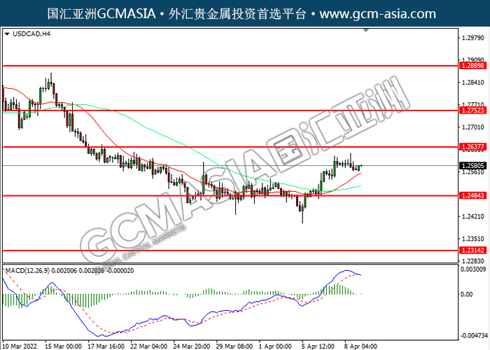 USDCAD,H4:美加低位反弹。然而,MACD多头动能略减,短期可关注技术性回调为主。上方关注1.2635压力和1.2750压力,下方关注1.2485支撑和1.2315支撑。