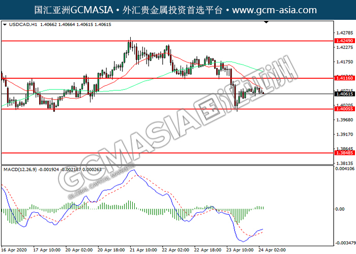 240420 USDCAD-午间 by keyk | Apr 24, 2020 | 美元兑加元 | 0 comments GCMAsia - USDCAD USDCAD 2020-04-24 USDCAD,H1:美加低位反弹。MACD多头动能略增,短期可持续关注多头为主。上方关注1.4115压力和1.4250压力,下方关注1.4005支撑和1.3850支撑。